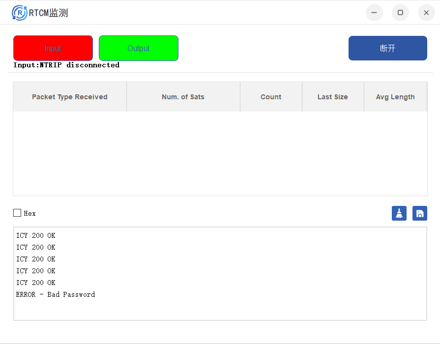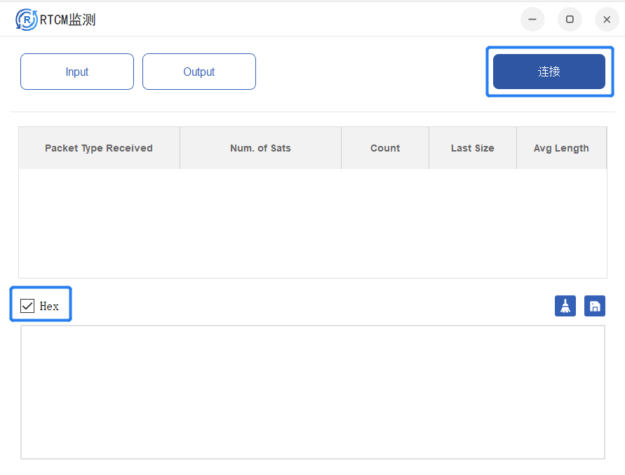 当 Input 和 Output 配置完成后,在 RTCM监测 窗口中勾选 Hex(十六进制),之后点击 连接 即可连接至 NTRIP 服务器。