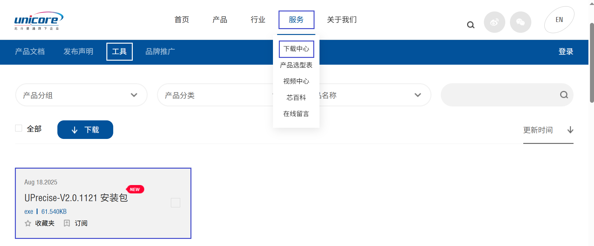 访问和芯星通官网:https://www.unicore.com/ ,在 服务 > 下载中心 中找到 工具,即可下载 UPrecise 软件安装包。