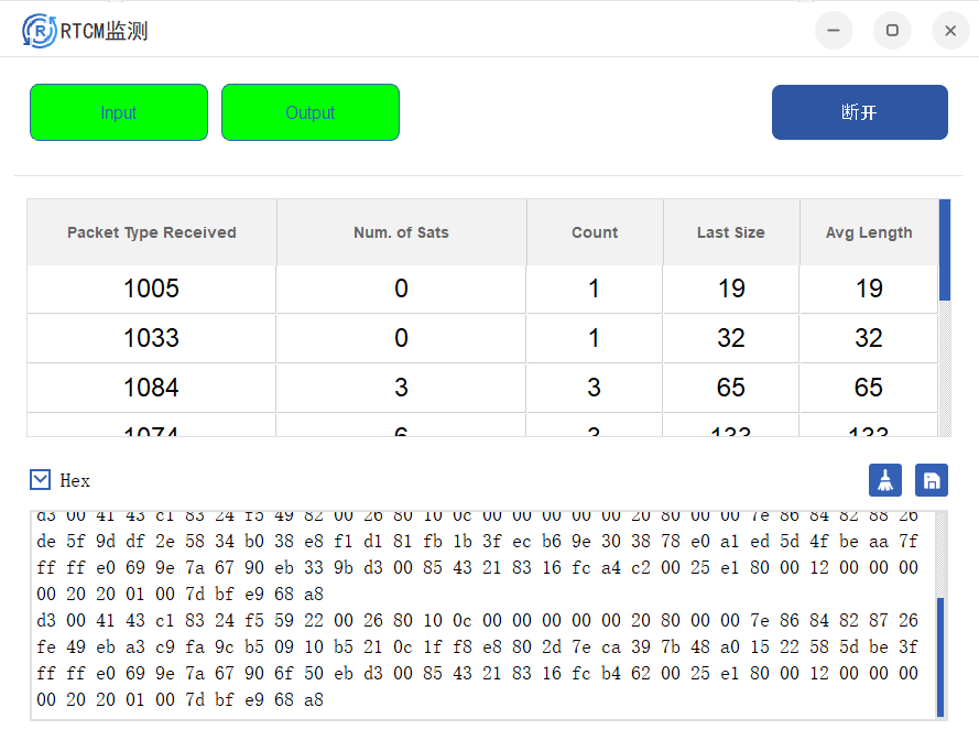 连接成功后,Input 和 Output 按钮变绿,窗口中会显示从服务器接收到的 RTCM 数据。